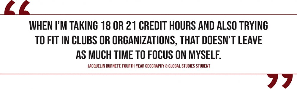 “When I’m taking 18 or 21 credit hours and also trying to fit in clubs or organizations, that doesn’t leave as much time to focus on myself,” Burnett said.