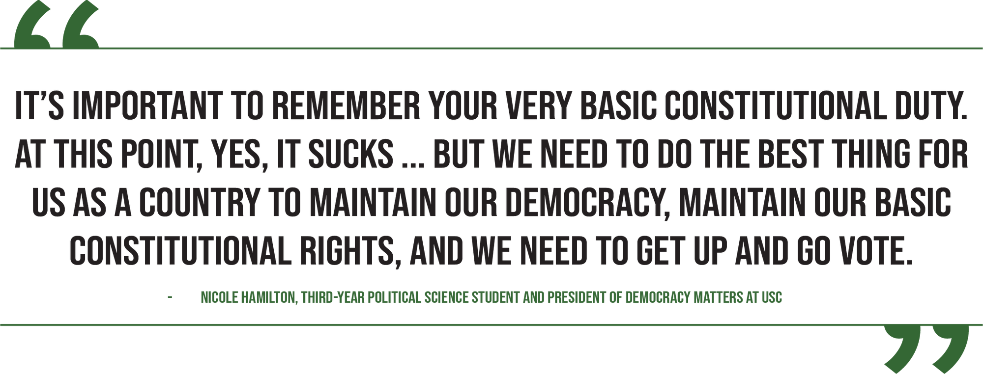 Nicole Hamilton, a third-year political science student and president of Democracy Matters at USC, said she was concerned about the community not being given time off to vote.