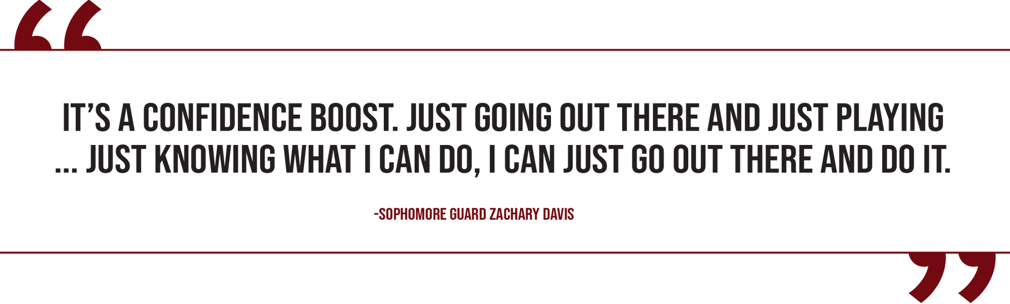 Davis said he credits his success and improvement in his scoring ability later in the season to gaining confidence as a scorer. Following the conclusion of the regular season, Davis averaged 5.7 points and 3.5 rebounds a game.