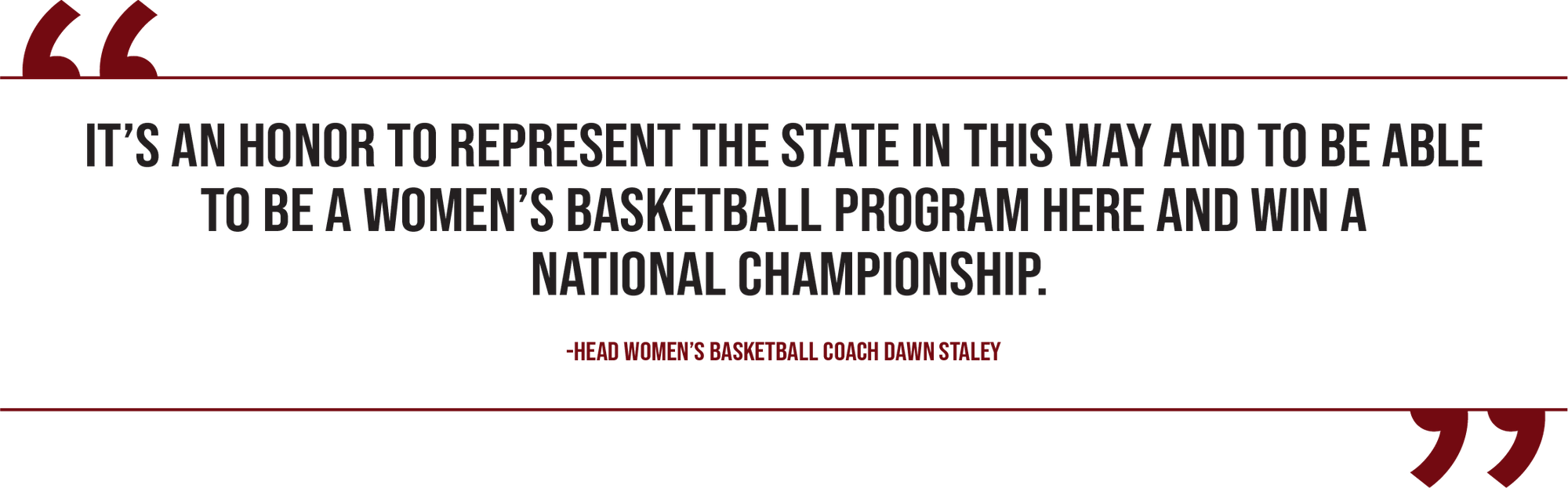 “When I do see (the signs), I’m thankful,” Staley said. “It’s an honor to represent the state in this way and to be able to be a women’s basketball program here and win a national championship.”