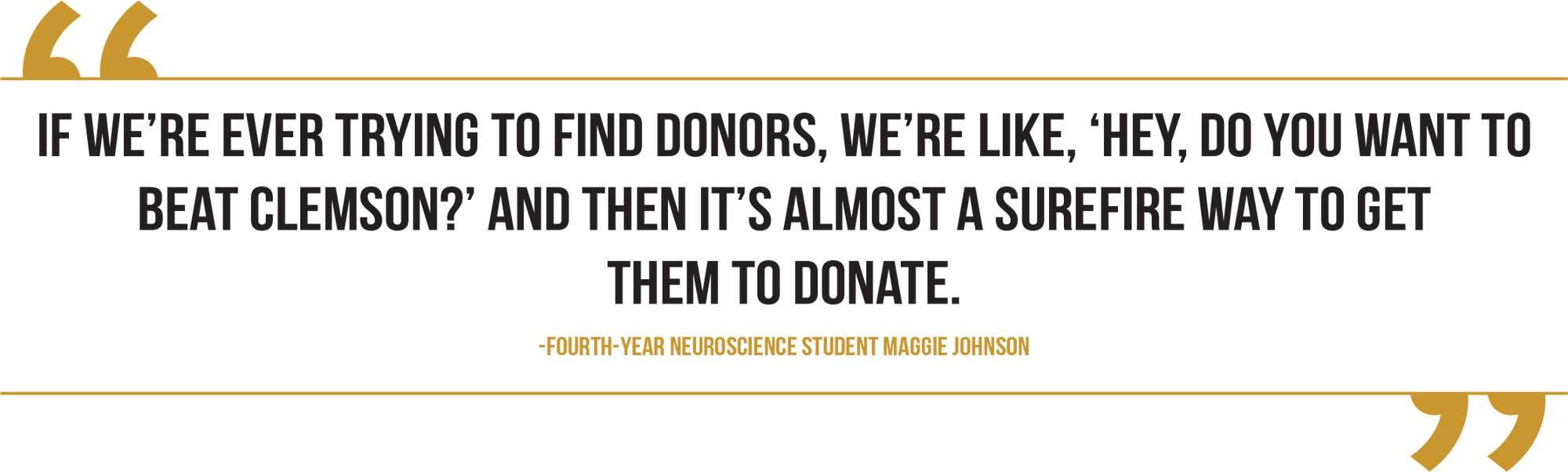 The Carolina-Clemson Blood Drive committee itself is made up of multiple students. For the committee’s president Maggie Johnson, a fourth-year neuroscience student, leading the drive is the best way she can contribute to the cause.