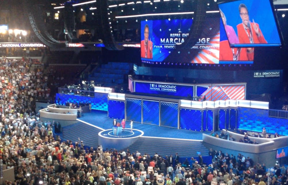 Democratic National Convention Chairwoman Marcia Fudge, Congresswoman from Ohio, raises her voice as delegates protest inside the Wells Fargo Center in Philadelphia on July 25, 2016.