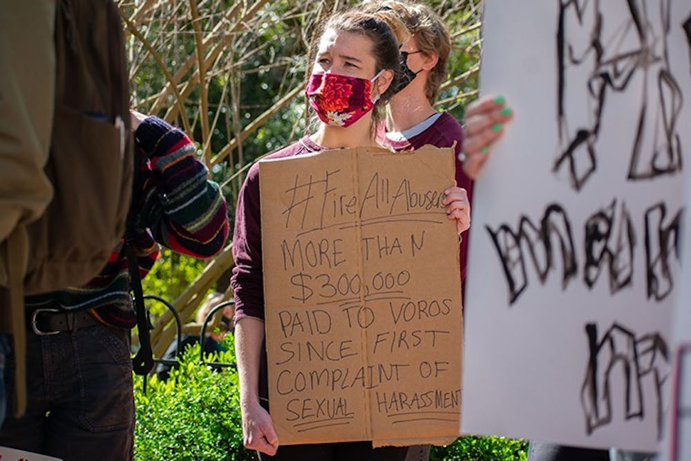 Students bring signs to protest the university’s lack of response toward professors accused of alleged sexual misconduct.