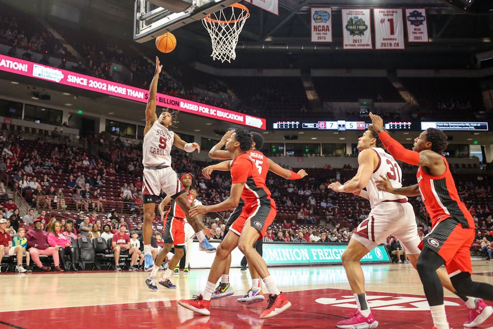 Sophomore guard Meechie Johnson goes up for a layup during South Carolina’s game against Georgia on March 4, 2023, at Colonial Life Arena. The Gamecocks beat the Bulldogs 61-55.