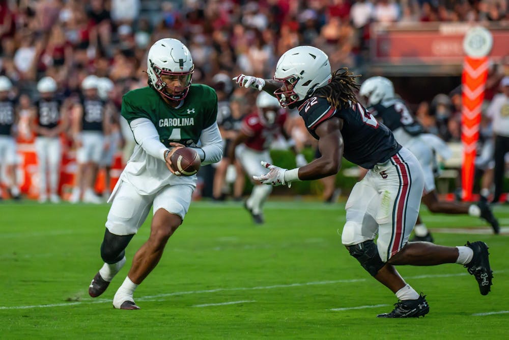 Redshirt senior quarterback Robby Ashford looks to sophomore running back Jawarn Howell for the handoff during the 2024 Garnet & Black Spring Game at Williams-Brice Stadium on April 20, 2024. Ashford enters his fifth year of eligibility after transferring from Auburn where he competed for the last two seasons.