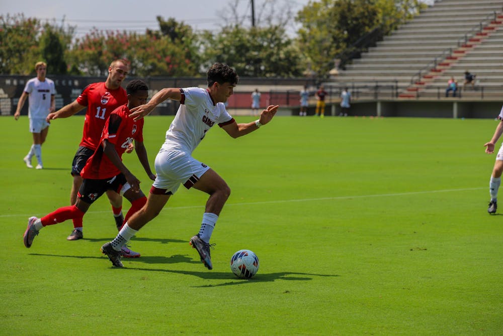 Sophomore midfielder Rocky Perez pushes the ball down the field during the match against Gardner-Webb on Aug. 27, 2023. The Gamecocks totaled 12 shots during the game, but only three shots on goal.