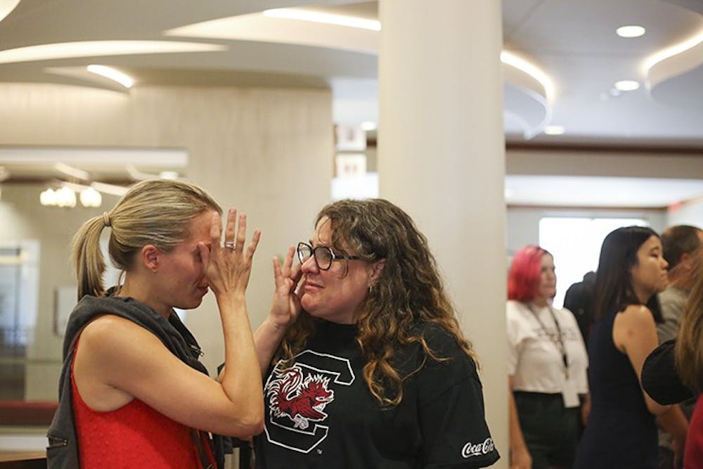 Faculty, protestors cry following the announcement of the selection of Gen. Robert Caslen as the 29th president of the University of South Carolina.