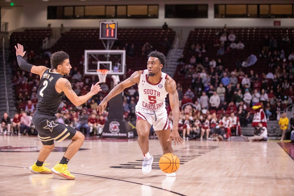 FILE—Redshirt junior guard Jermaine Custard dribbles around a defender during a game against Vanderbilt on January 26, 2022 at Colonial Life Arena. The Gamecocks lost to Mississippi State on February 1, 2022.