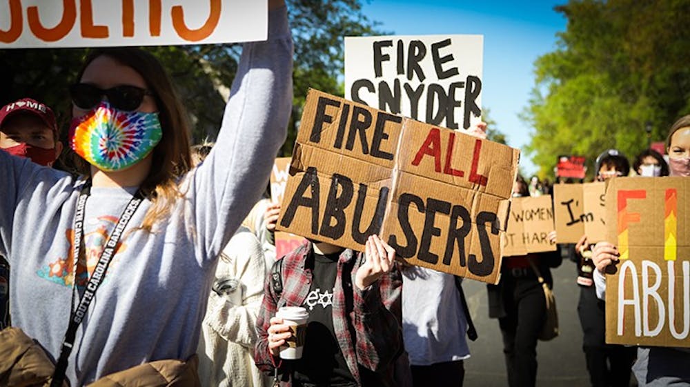A marching protestor holds a sign that has the quote, “FIRE ALL ABUSERS” on it, which was written on many signs at the protest.