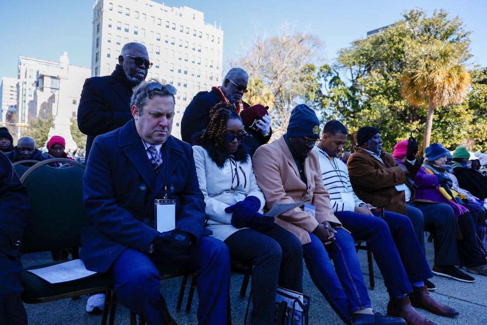 A group of attendees pray together at the King Day at the Dome program at the South Carolina Statehouse on Jan. 20, 2025. The day's speeches were moderated by local WFMV Radio host Tony Jamison
