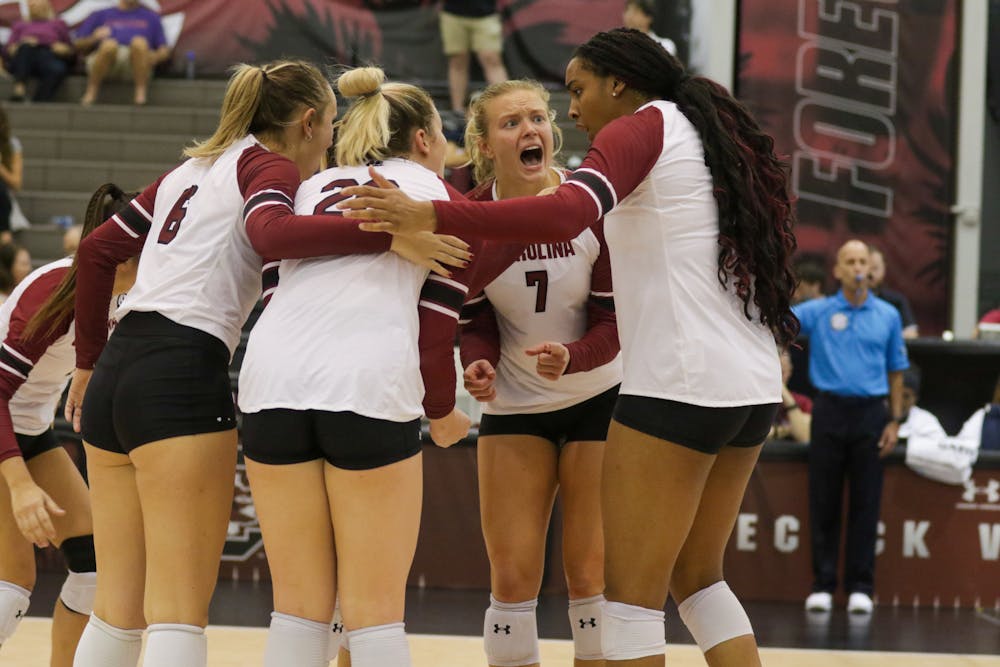 Senior outside McKenzie Moorman celebrates a point with her teammates at South Carolina’s game against Mizzou on Oct. 1, 2022. Strong defensive play earned the South Carolina volleyball team two victories over conference opponent Missouri this weekend.