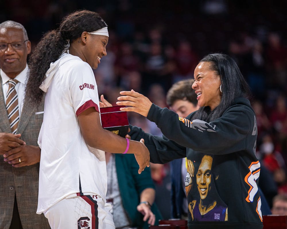 Sophomore forward Sania Feagin (left) and head coach Dawn Staley (right) laugh together after Staley gives Feagin her national championship ring. South Carolina played East Tennessee State on Nov. 7, 2022. The Gamecocks beat the Buccaneers 101- 31.