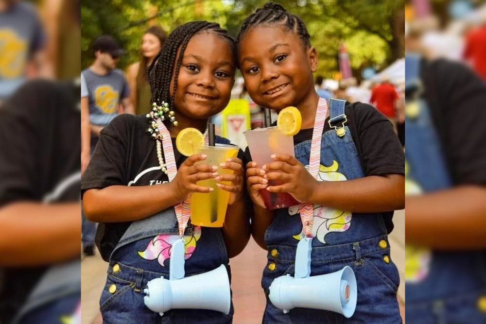 Faith and Malia Jeffcoat, better known as the Lemonade Twins, pose for a portrait photograph with their classic beverages at Soda City market in Columbia, South Carolina. Flavors such as cotton candy came from collaborations with each other as well as business partners.