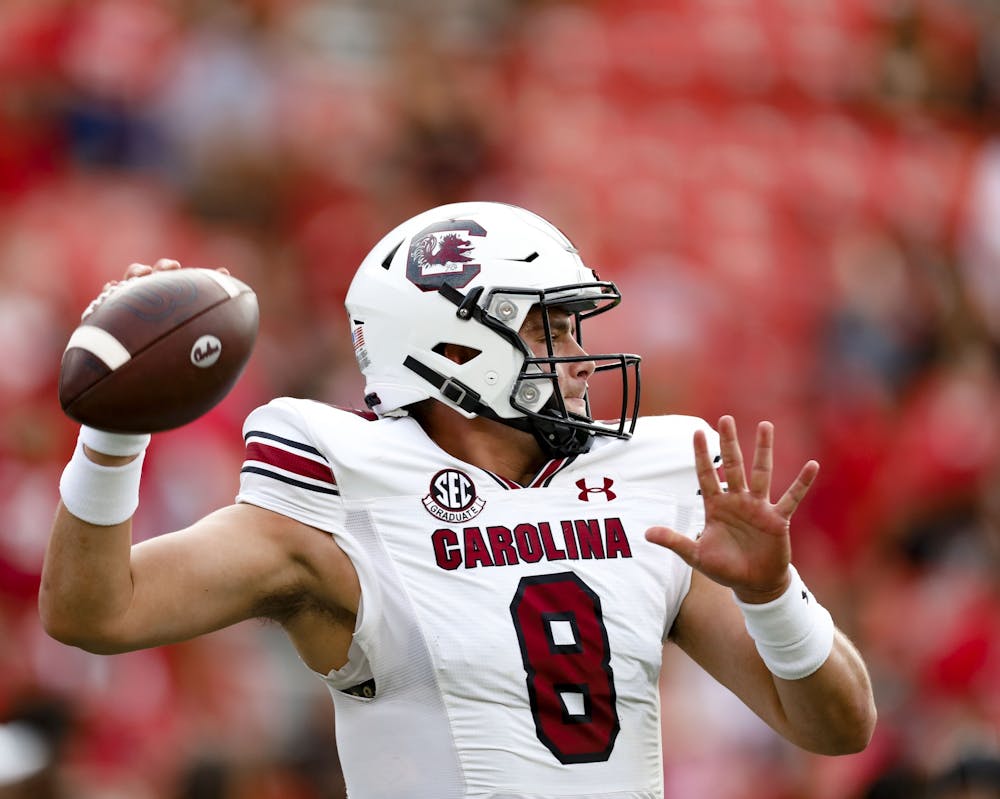 Graduate assistant quarterback Zeb Noland warms up his passing arm before South Carolina's game against Georgia on Sept. 18, 2021.