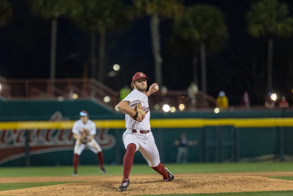 Redshirt sophomore pitcher Jackson Phipps throws from the top of the mound on Feb. 24, 2023, at Founders Park during the Gamecock's matchup against the Fighting Quakers. The Gamecocks won the first game in the series 7-4.
