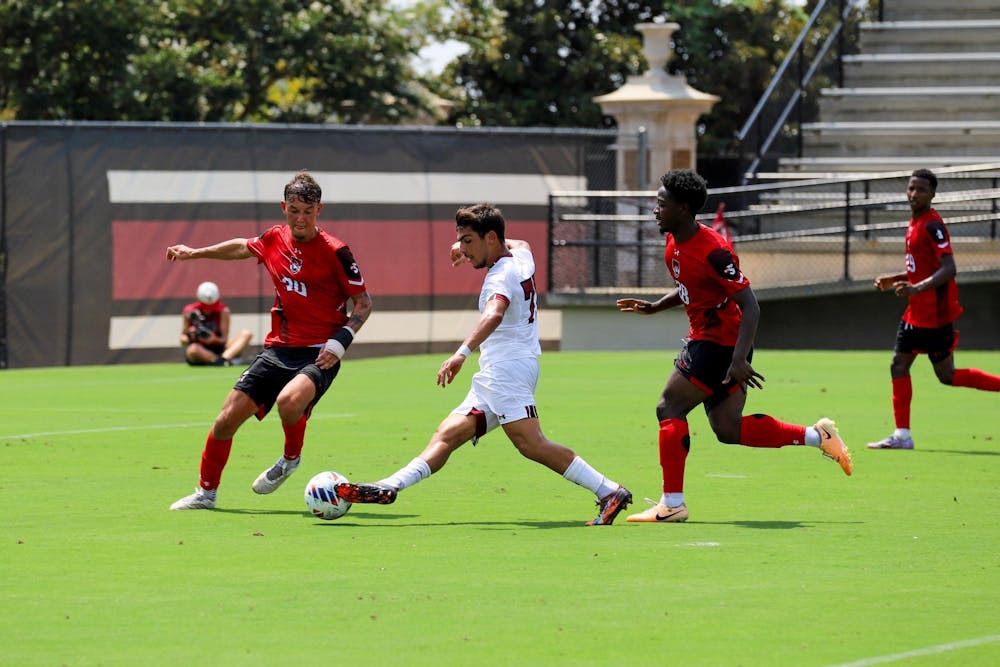 Freshman midfielder Pantelis Gavriel passes the ball to one of his teammates as he gets double-teamed close to Gardner-Webb's goal. The Gamecocks fell to the Bulldogs 2-0 in its first home game of the season.