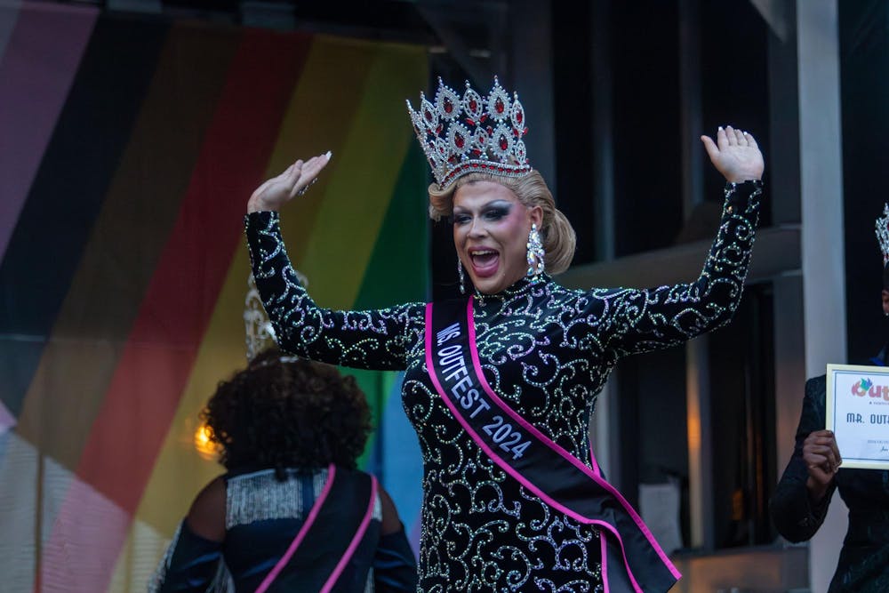 Drag performer Colbi J with her hands raised after winning Ms. Outfest 2024 on June 1, 2024. Outfest, hosted by South Carolina Pride, also has a drag pageant with three different titles to win: Mr., Ms., and Mx.