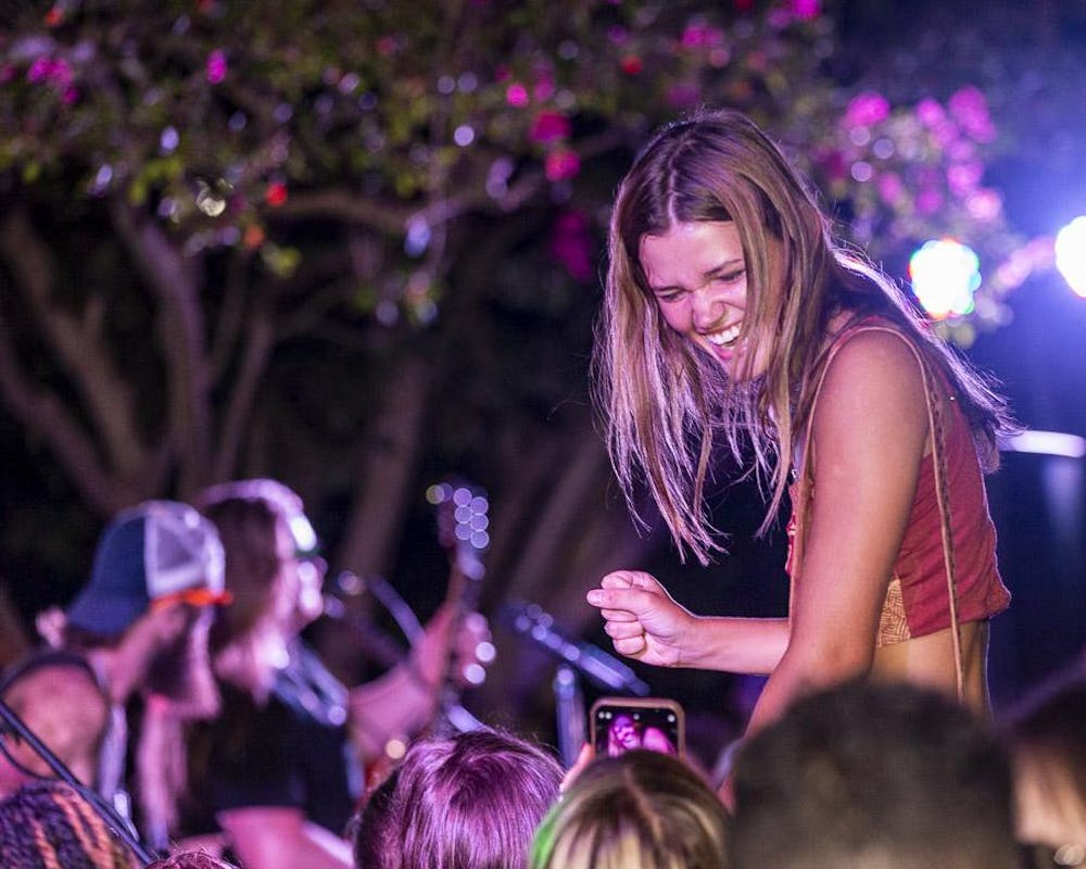 A South Carolina student sits atop her friend's shoulders during a concert at the First Night Carolina event on Aug. 23, 2023. The event featured musical performances from The L.A. Maybe and DJ iAM.