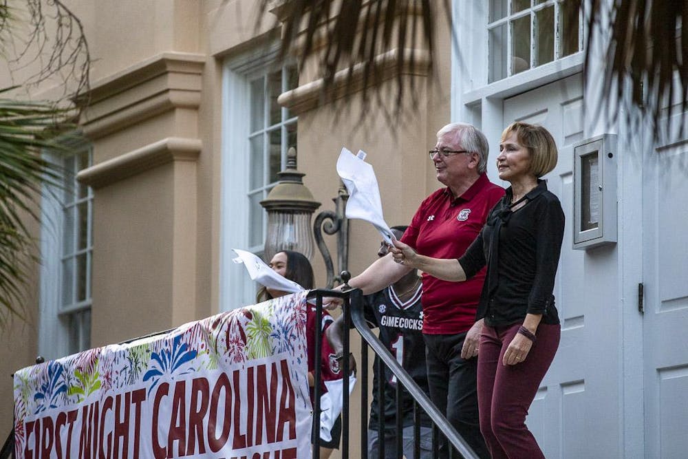 USC President Michael Amiridis (left) and his wife Ero Aggelopoulou-Amiridis (right) throw up their ralley towels during the playing of "Sandstorm" at the First Night Carolina event on Aug. 23, 2023. President Amiridis and head football coach Shane Beamer gave speeches during the event.
