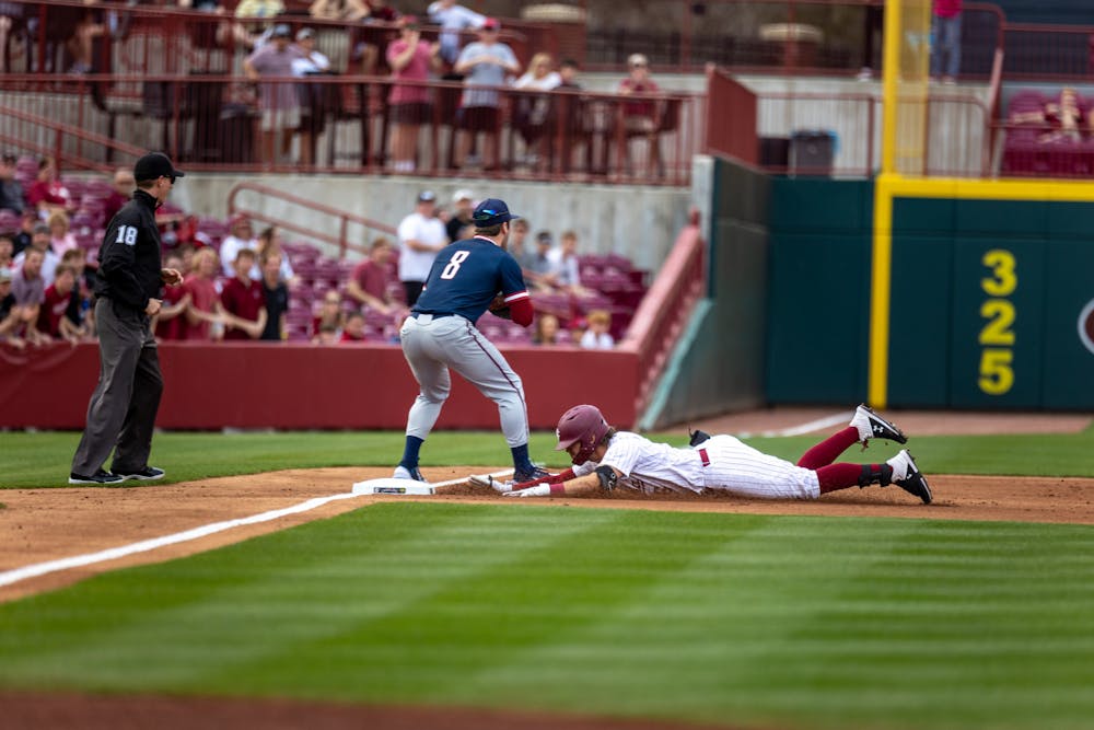 Fifth-year infield Will McGillis slides onto third base and is safe during the South Carolina matchup against UPenn at Founders Park on Feb. 24, 2023. The Gamecocks won the first game in the series 7-4.