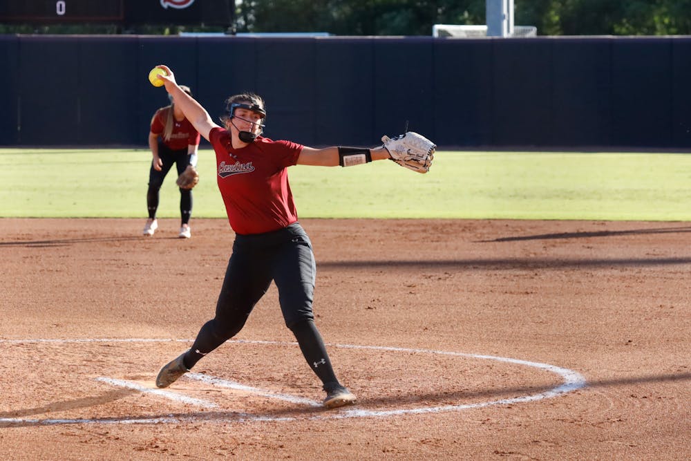Freshman pitcher Reganne Bennett winds up in the circle to pitch to a USC Beaufort hitter at Beckham Field on Oct. 7, 2023. Before defeating USC Beaufort 3-0, the Gamecocks beat Wofford earlier in the day.