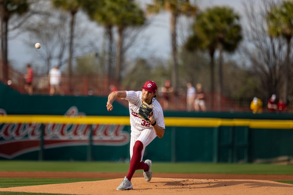 Pitching for most of the game, junior pitcher Will Sanders throws the ball to the Gamecock catcher. The game took place in Founders Park on Feb. 24, 2023, with the Gamecocks playing the the Fighting Quakers. South Carolina had won both games so far in its three-game series, with the first score being 7-4 and the other 1-0.