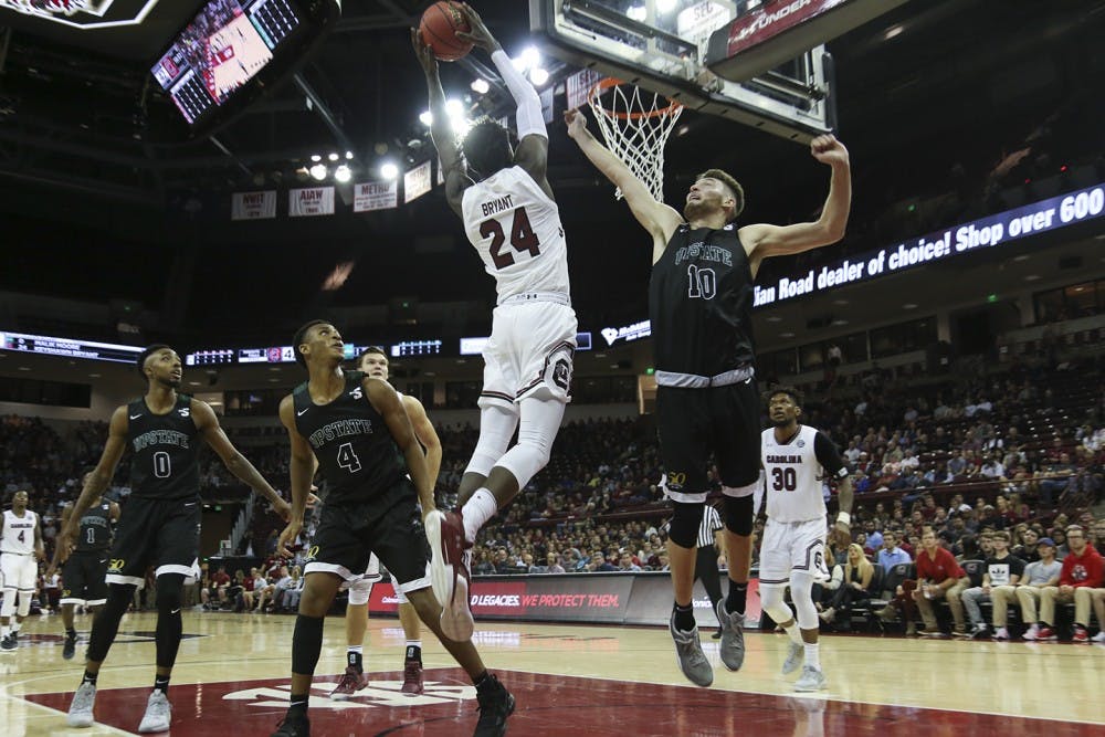 Senior Keyshawn Bryant jumps for a layup. Bryant is one of the returning players on the team, who will be playing alongside 9 new members of the mens basketball team this season.