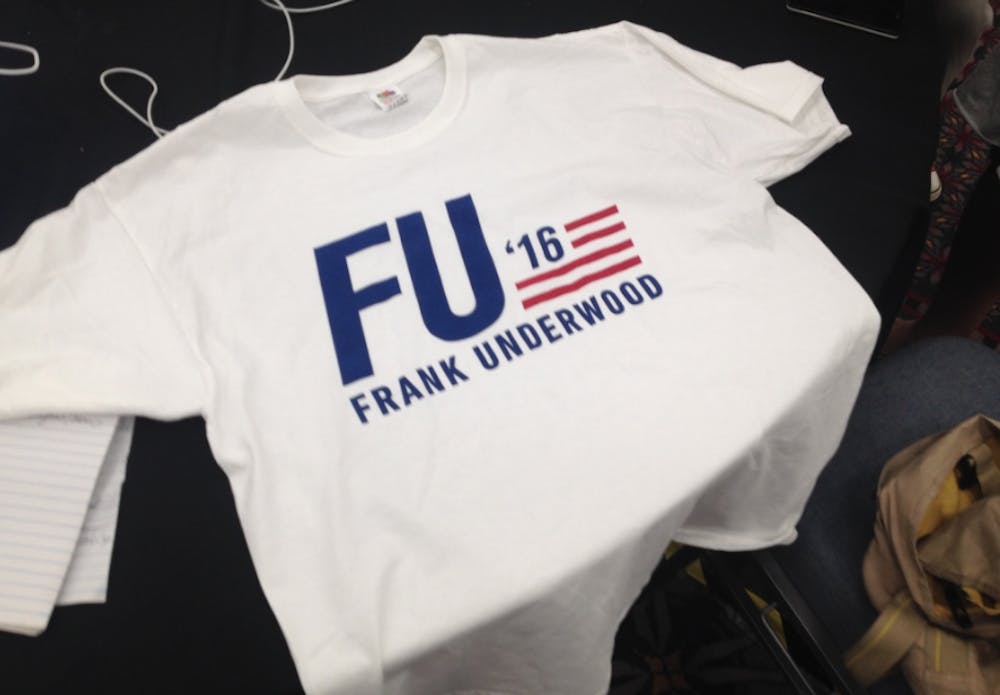 A t-shirt being distributed at the Democratic National Convention advertises the television show 'House of Cards,' whose main character Frank Underwood is a politician from South Carolina who, through blackmail, violence and cunning, becomes president of the United States. The shirts were being given away for free in Philadelphia on July 28, 2016.