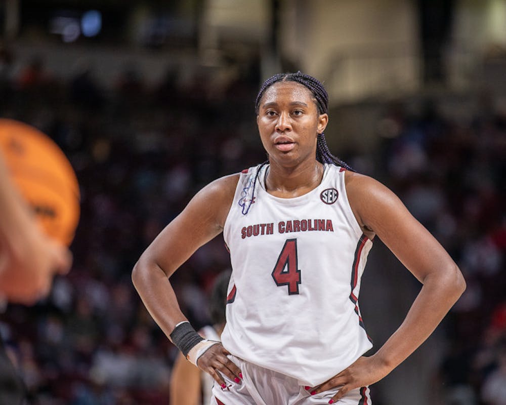FILE— Senior forward Aliyah Boston stares down the referee as she prepares for her free-throw. South Carolina beat East Tennessee State 101-31 on Nov. 7, 2022. Boston was instrumental to the victory South Carolina got over Standford during their match on Nov. 20, 2022, scoring a total of 14 points in 29 min of play time.