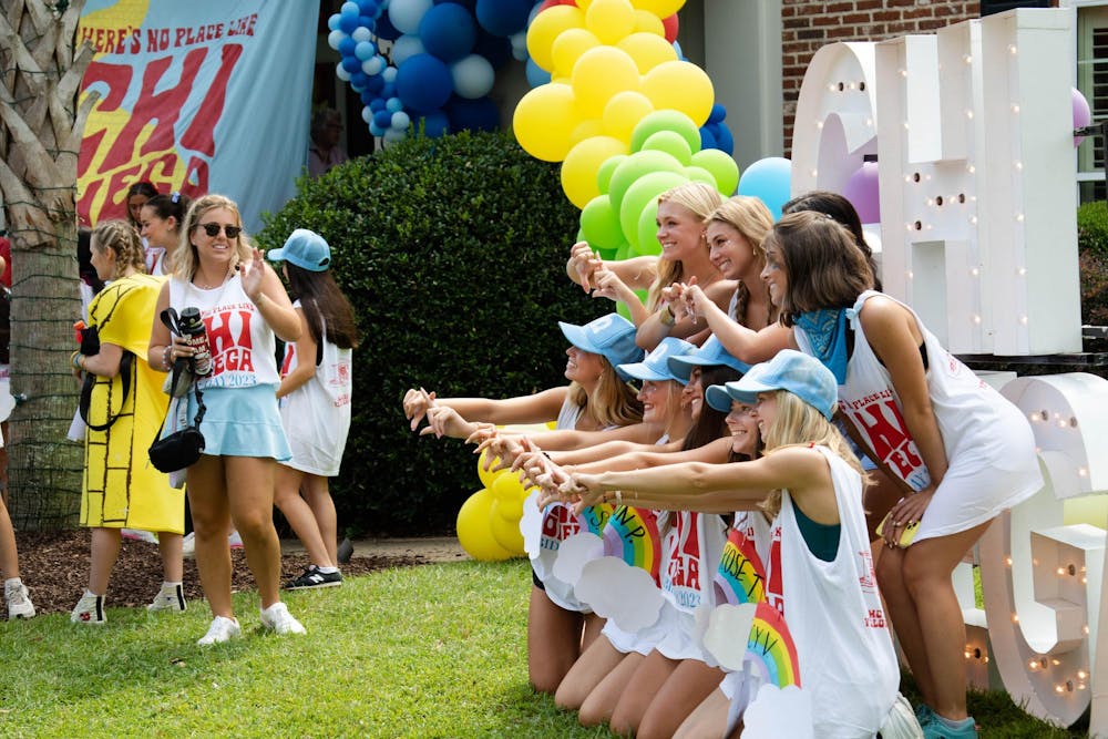 Yellow sidewalks and balloons decorate the Chi Omega house in Greek Village on Aug. 27, 2023. New members and sisters posed on the lawn for pictures to commemorate the excitement of Bid Day.