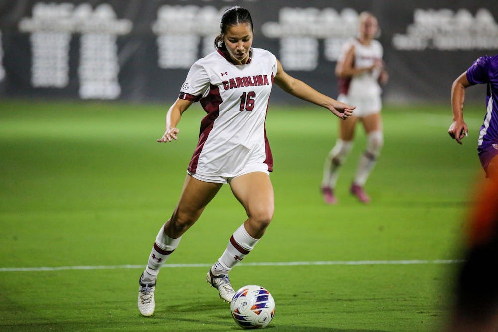 Freshman forward and midfielder Autumn Cayelli carries the ball during South Carolina’s match against LSU at Stone Stadium on Oct. 5, 2023. The Gamecocks beat the Tigers 1-0.