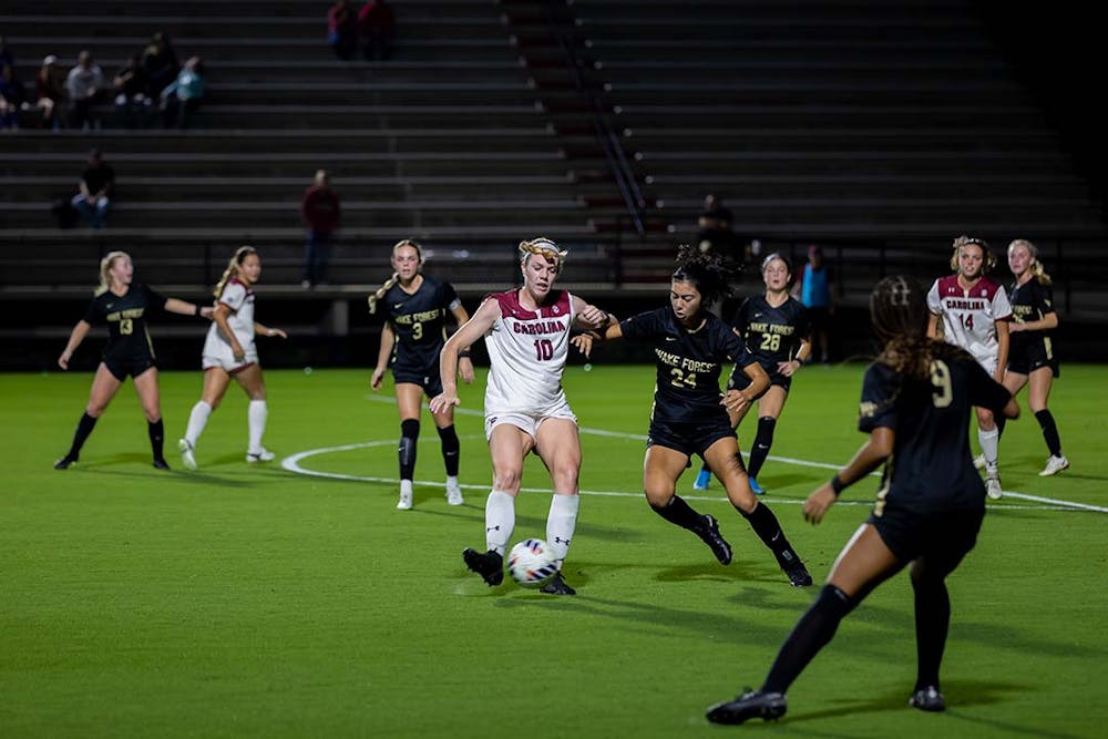 Junior forward Catherine Barry keeps contact with the ball while Wake Forest opponents close in. Barry contributed to the score, making one goal against Wake Forest at Stone Stadium on Nov. 12, 2022.