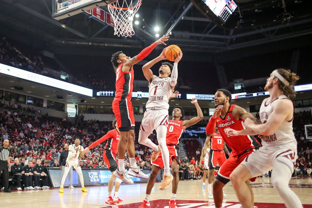 Sophomore guard Jacobi Wright goes up for a shot during South Carolina’s game against Georgia on March 4, 2023, at Colonial Life Arena. The Gamecocks beat the Bulldogs 61-55.