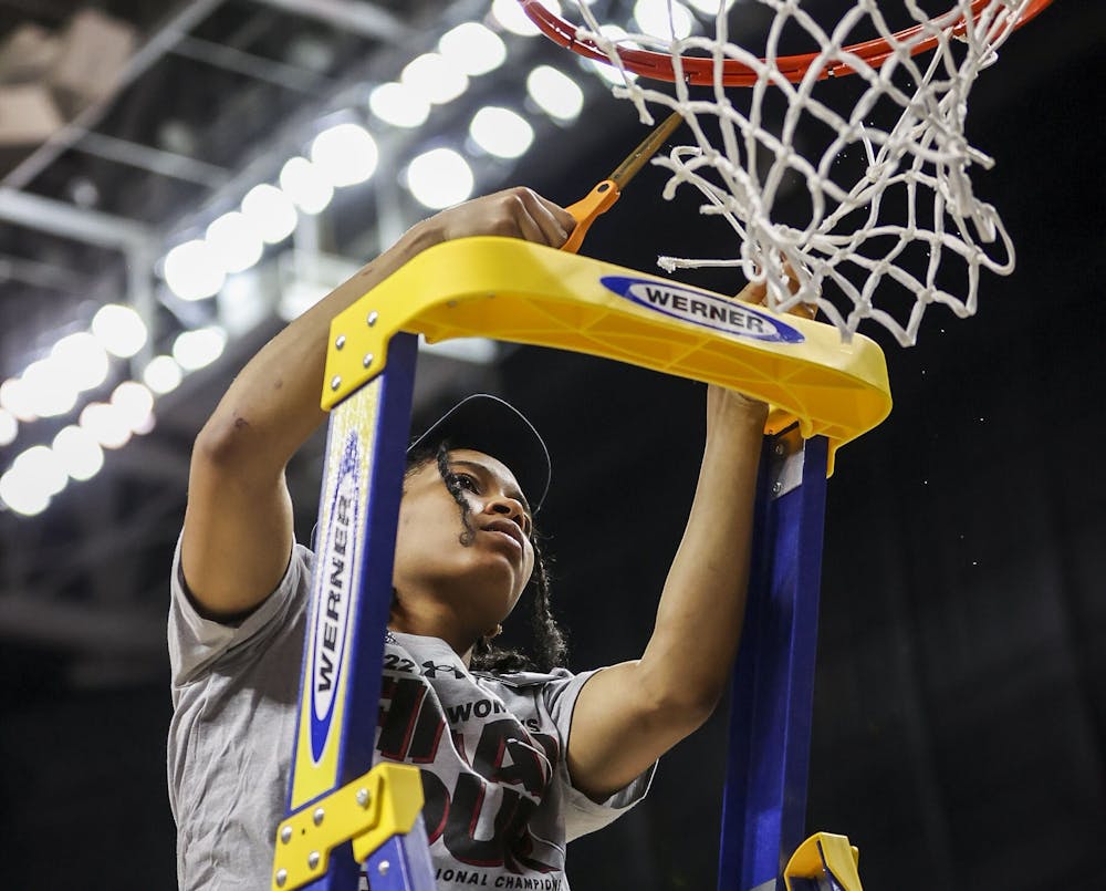 Junior guard Zia Cooke cuts the net after South Carolina's 80-50 victory over Creighton in the Elite Eight on Sunday, March 27, 2022. The win propelled the team to the Final Four.