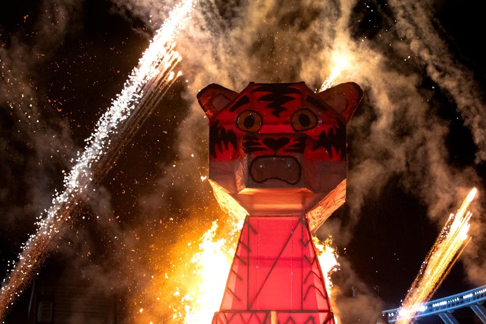 Fireworks go off as the wooden tiger — constructed by the USC chapter of the American Society of Mechanical Engineers and the Society of Hispanic Professional Engineers — is set aflame. The tiger has been built to be more than 30 feet tall for several years.