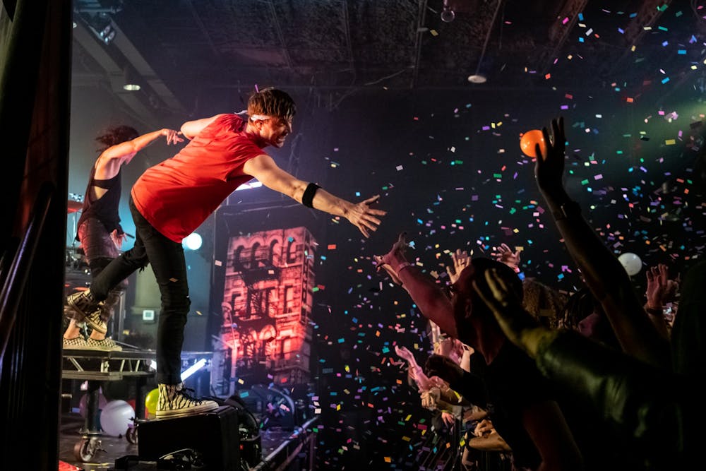 Matt Johnson reaches out to a fan during the Matt and Kim concert at The Senate in Columbia Nov. 17, 2019. Johnson plays keyboard and sings in the band.