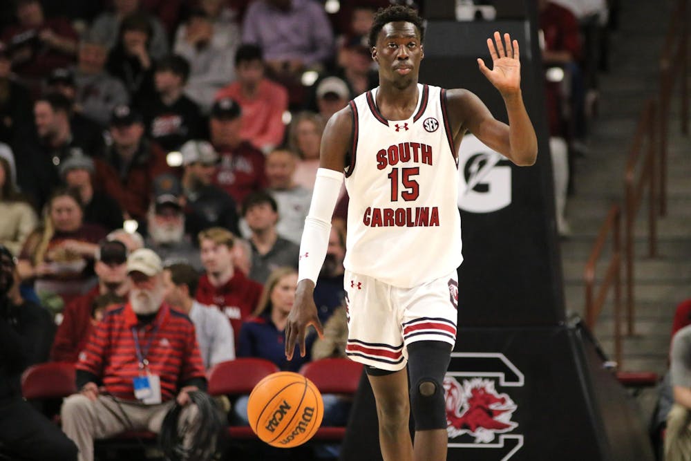 Freshman guard Morris Ugusuk calls a play as he brings the ball upcourt on Jan. 6, 2024. South Carolina beat Mississippi State 68-62 and are now 13-1.