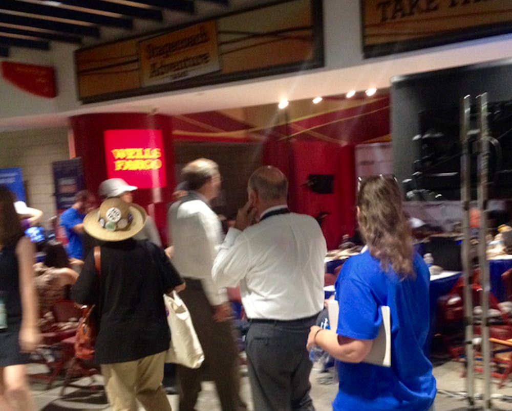 Former White House Chief of Staff Bill Daley, center, talks on his cell phone while walking through the Wells Fargo Center on the first day of the Democratic National Convention in Philadelphia on July 25, 2016.