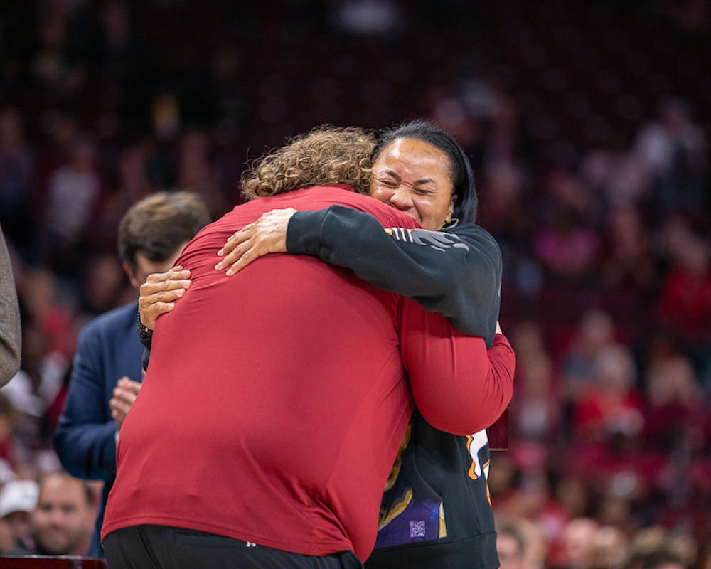 Head coach Dawn Staley embraces athletic trainer Craig Oates while giving him his championship ring. South Carolina played East Tennessee State on Nov. 7, 2022. The Gamecocks beat the Buccaneers 101- 31.
