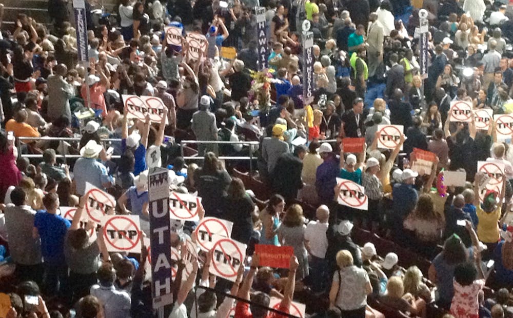 Delegates at the Democratic National Convention in Philadelphia protest the Trans-Pacific-Partnernship (TPP) on July 25, 2016.