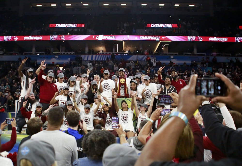 The South Carolina women's basketball team celebrates its 2022 national championship win