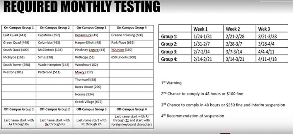 Under the required monthly testing plan for the spring semester, all students who need to be tested have been divided into four groups based on where they live and what letters their names start with. Each group will be assigned a week to get tested for COVID-19.