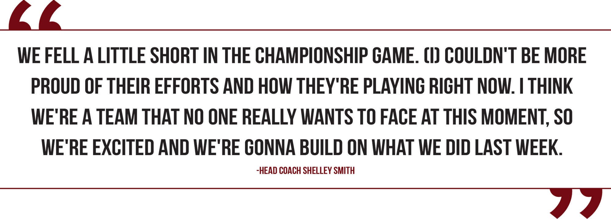 "We fell a little short in the championship game," Smith said. "(I) couldn't be more proud of their efforts and how they're playing right now. I think we're a team that no one really wants to face at this moment, so we're excited and we're gonna build on what we did last week."