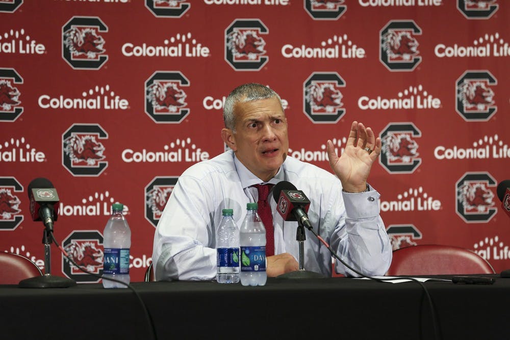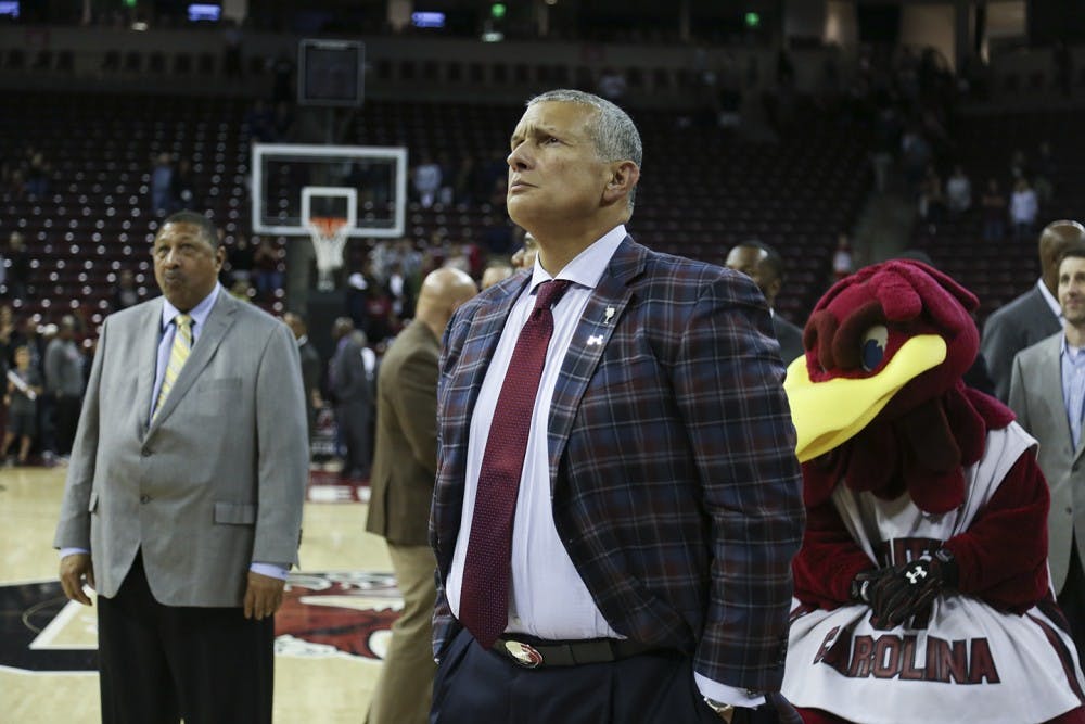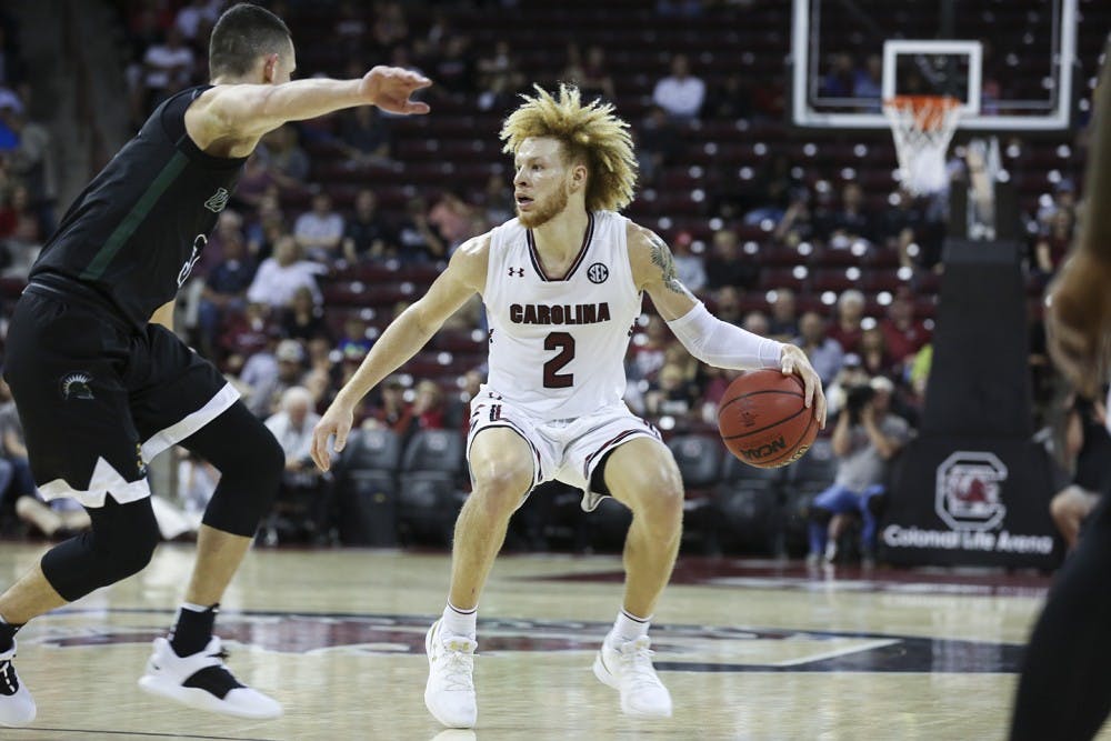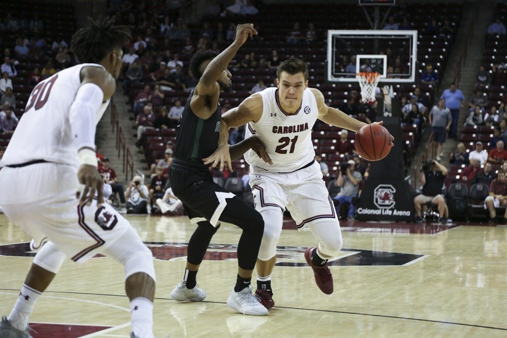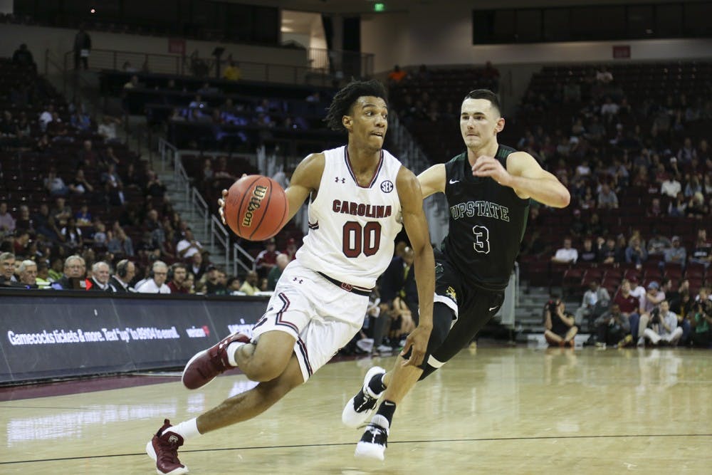 USC Men's Basketball versus. USC Upstate Senior Keyshawn Bryant jumps for a layup. Bryant is one of the returning players on the team, who will be playing alongside 9 new members of the mens basketball team this season.