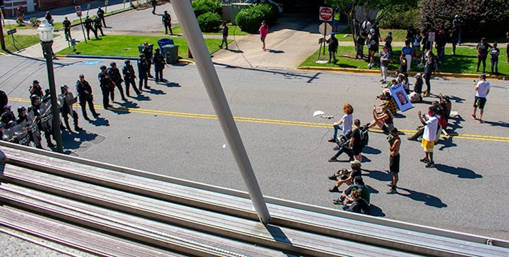 Protesters kneel across from a line of armed police officers in front of the Columbia Municipal Court at the “I Can’t Breathe” protest on May 30.