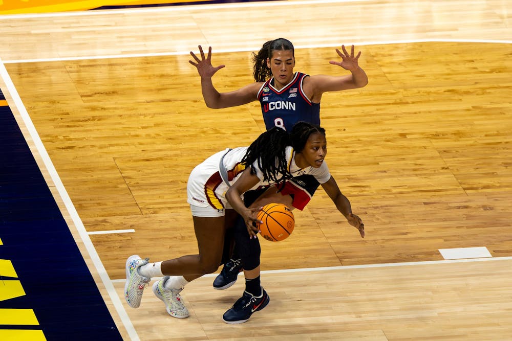 Freshman forward Joyce Edwards dribbles the ball around a UConn defender during the National Championship game on April 6, 2025 at Amalie Arena. Edwards scored 10 points and got five rebounds against the Huskies.
