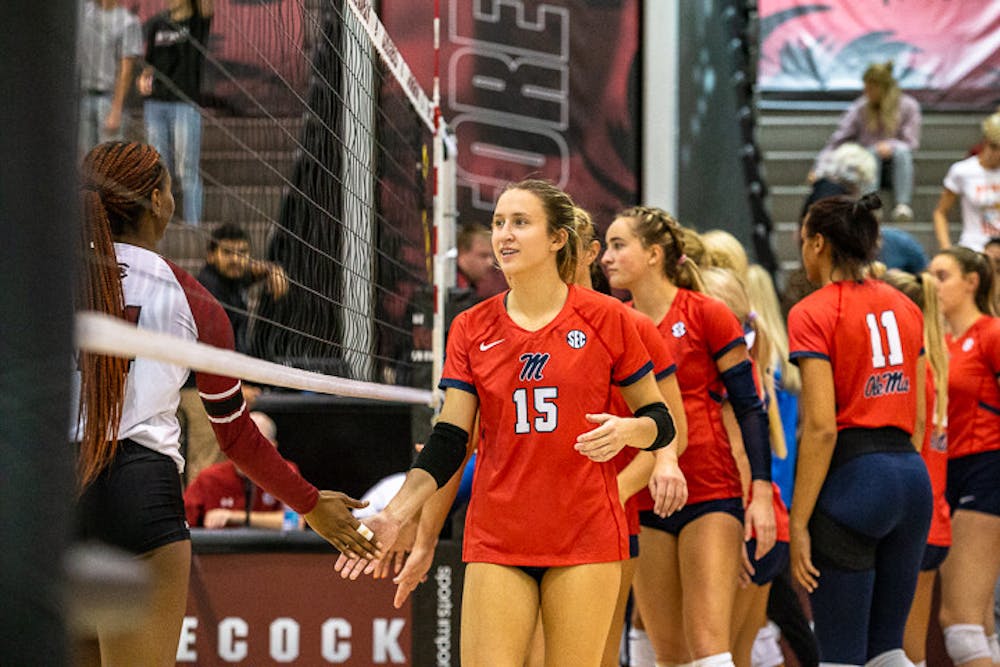 Ole Miss freshman setter Aly Borellis high-fives a member of the South Carolina volleyball team after their matchup on Nov. 5, 2022. Ole Miss won the match 3-1, scoring 25-21 in the final set of the game.