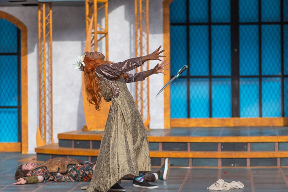 The character Flute, portrayed by second-year theatre student Phillip Parker acts out being fatally wounded by a sword during the final act of "A Midsummer Night's Dream" on Oct. 9, 2022. The character Flute is performing the tragedy of Pyramus and Thisbe to the Duke of Athens in this final scene of the play.