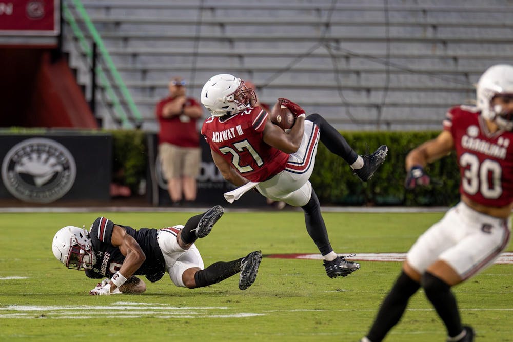 Graduate student running back Oscar Adaway III falls to the ground after catching a pass for Team Garnet in the spring football game at Williams-Brice Stadium on April 18, 2025. Team Garnet defeated Team Black 10-7.