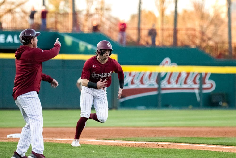 Fifth-year infielder Parker Noland runs to home base and scores against Queens on Feb. 21, 2024. Noland had two runs for the Gamecocks during its 13-3 victory over the Lions at Founders Park.